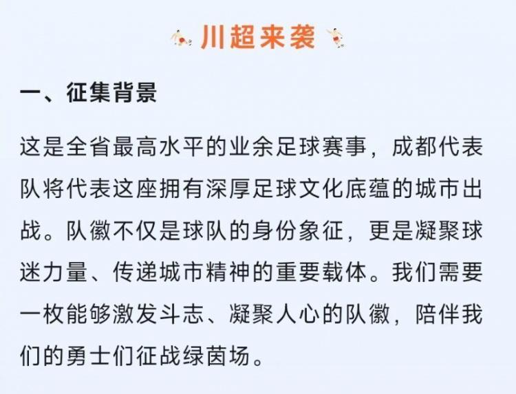 设计需求体现成都特色、彰显足球精神、设计简洁醒目、色彩协调鲜明,且必须为原创作品。投稿时间为9月4日-9月7日。